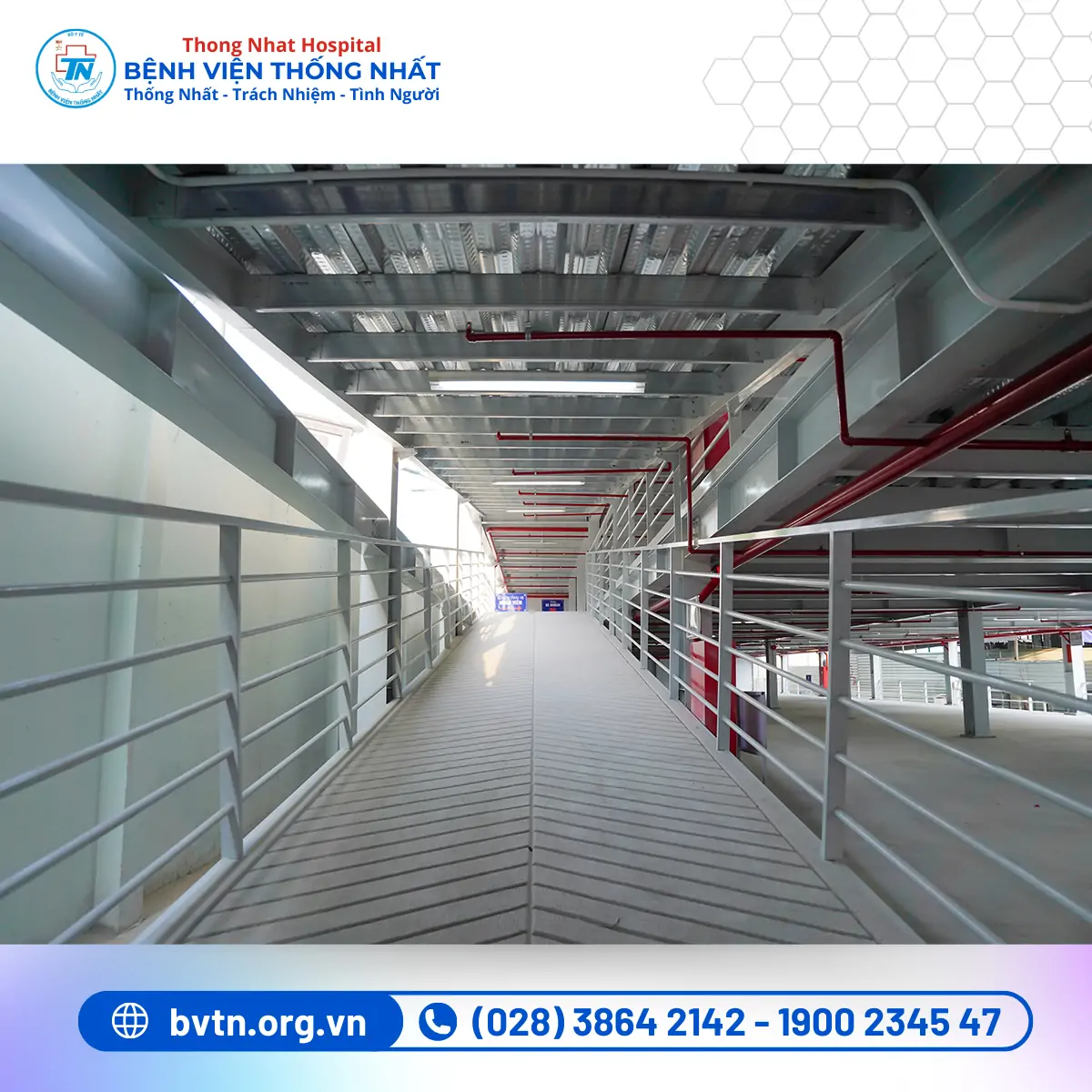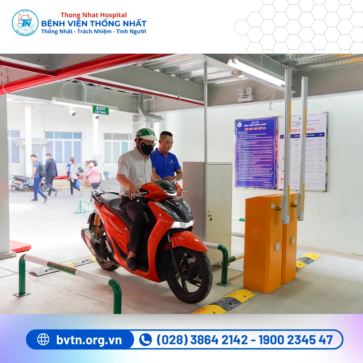 Vị trí nhà xe tọa lạc ngay tại vị trí nhà xe nhân viên cũ, được xây dựng bằng khung thép tiền chế với quy mô một tầng trệt, 3 tầng lầu với tổng diện tích sàn 3.000 mét vuông, có thể sử dụng để khoảng 2.000 chiếc xe hai bánh. Để thuận tiện cho người sử dụng, Bệnh viện bố trí khu vực tầng 1 là nơi để xe cho người già yếu, phụ nữ mang thai; tầng 1 là cho bệnh nhân, tầng 2 và tầng 3 dành cho nhân viên y tế, học sinh, sinh viên và khách đến liên hệ công tác. Ngoài nhà xe này, Bệnh viện còn có các bãi giữ xe khác trong khuôn viên.