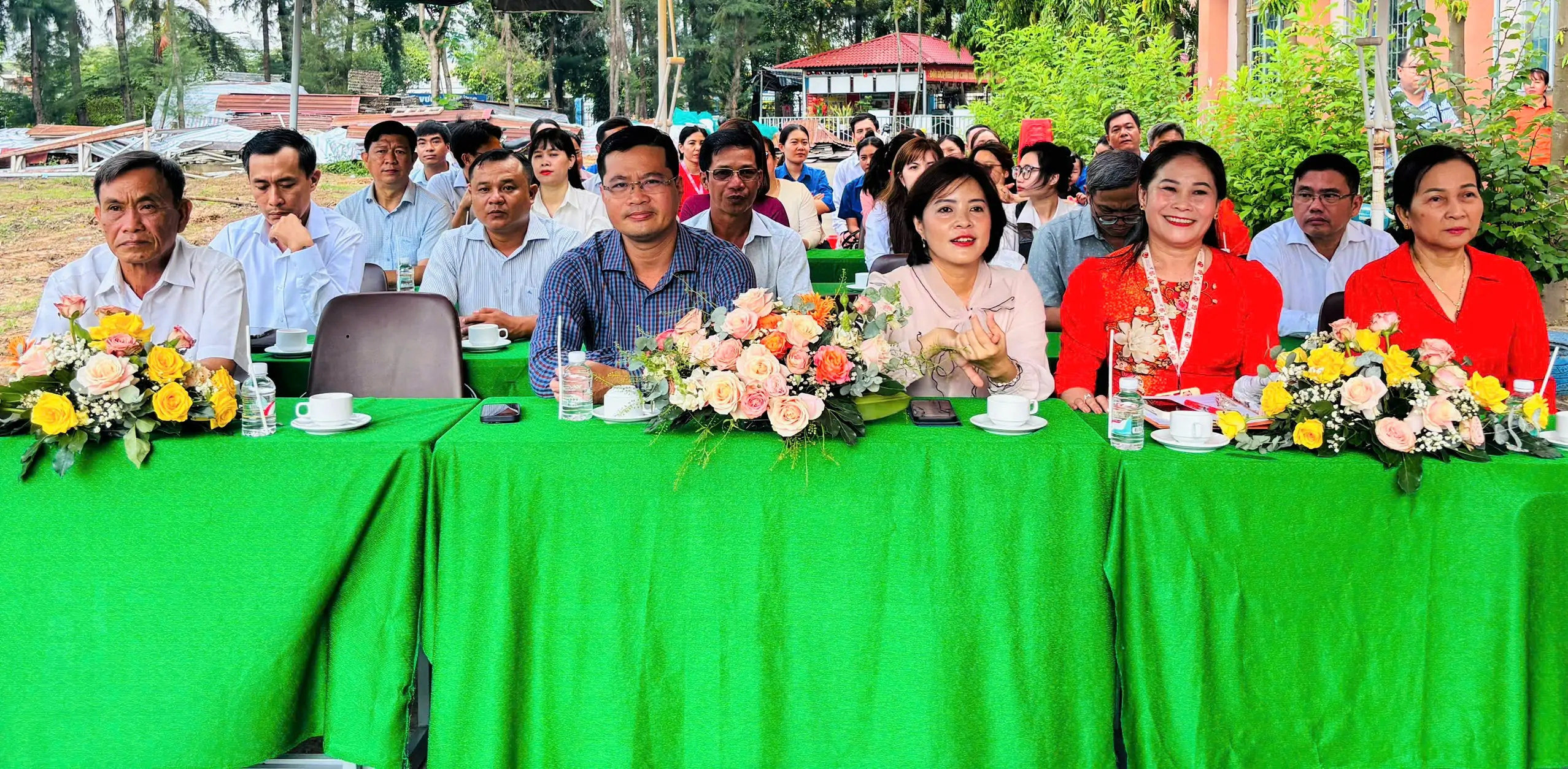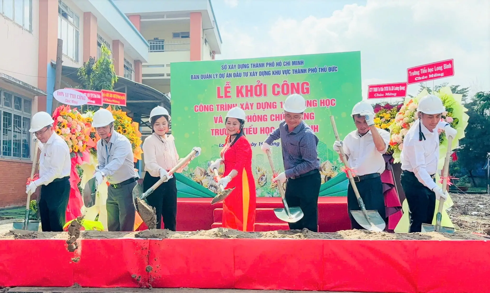 Tham dự buổi lễ có các đồng chí: Nguyễn Thị Tuyết Nga, ĐUV, Phó Chủ tịch UBND phường Long Bình; Nguyễn Ngọc Tuấn, Bí thư Đảng ủy, Giám đốc Ban Quản lý dự án đầu tư xây dựng khu vực TP Thủ Đức; Trương Hoài Tâm - Bí thư chi bộ, Hiệu trưởng Trường Tiểu học Long Bình và Ông Hoàng Vũ Nam Anh - Giám đốc Công ty CP Xây lắp và Vật Tư xây dựng 2 đại diện Đơn vị thi công...