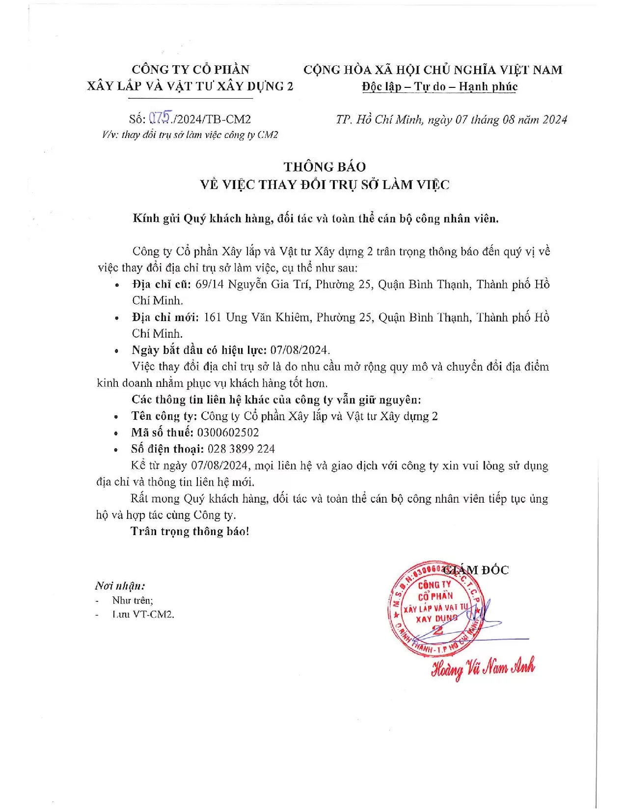 Công ty Cổ phần Xây lắp và Vật tư Xây dựng 2 trân trọng thông báo đến quý vị về việc thay đổi địa chỉ trụ sở làm việc, cụ thể như sau: